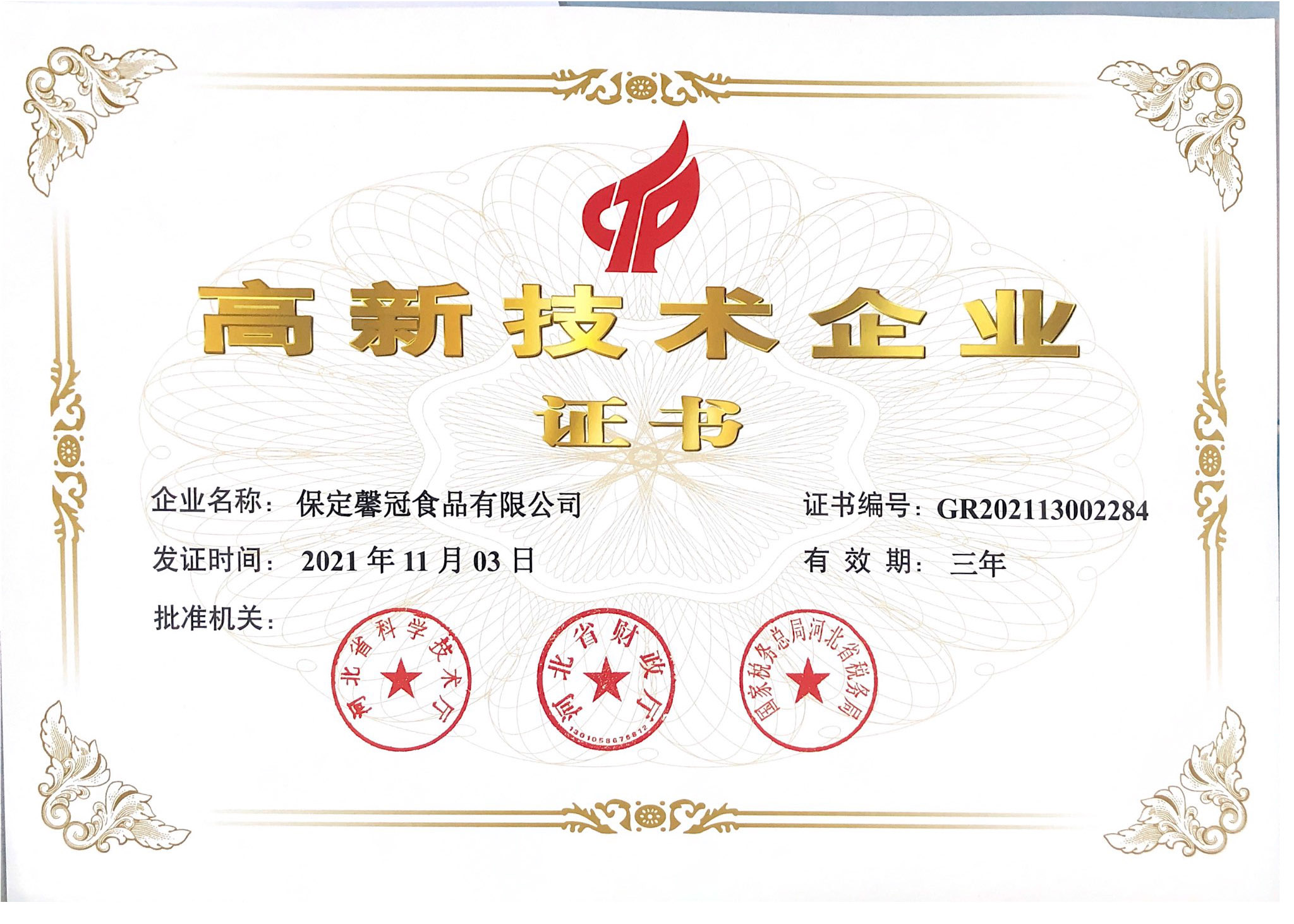 祝賀保定馨冠食品有限公司被評為“高新技術(shù)企業(yè)”